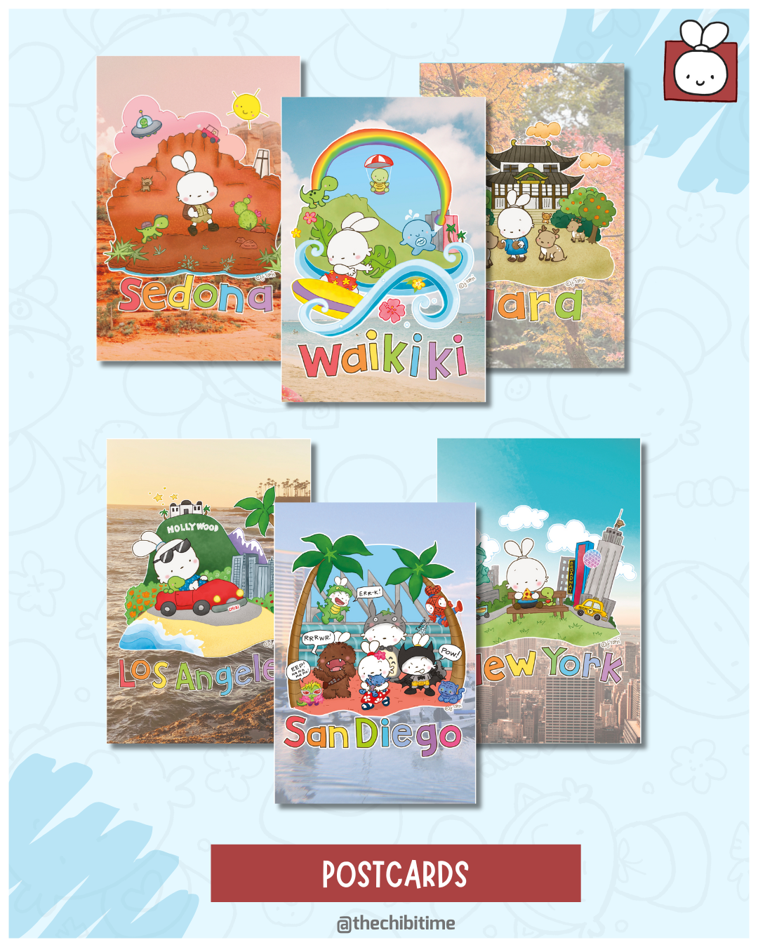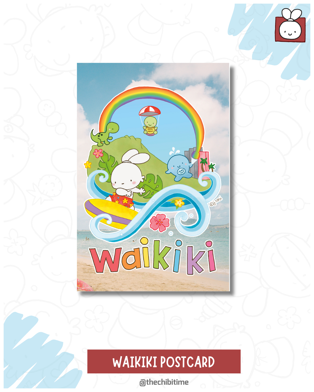From the bowing deer in Nara to breezy beach days in Waikiki, Chibi Usagi has been wandering far and wide! This 4x6 postcard from our Chibi Wanders collection features our favorite wanderer visiting: