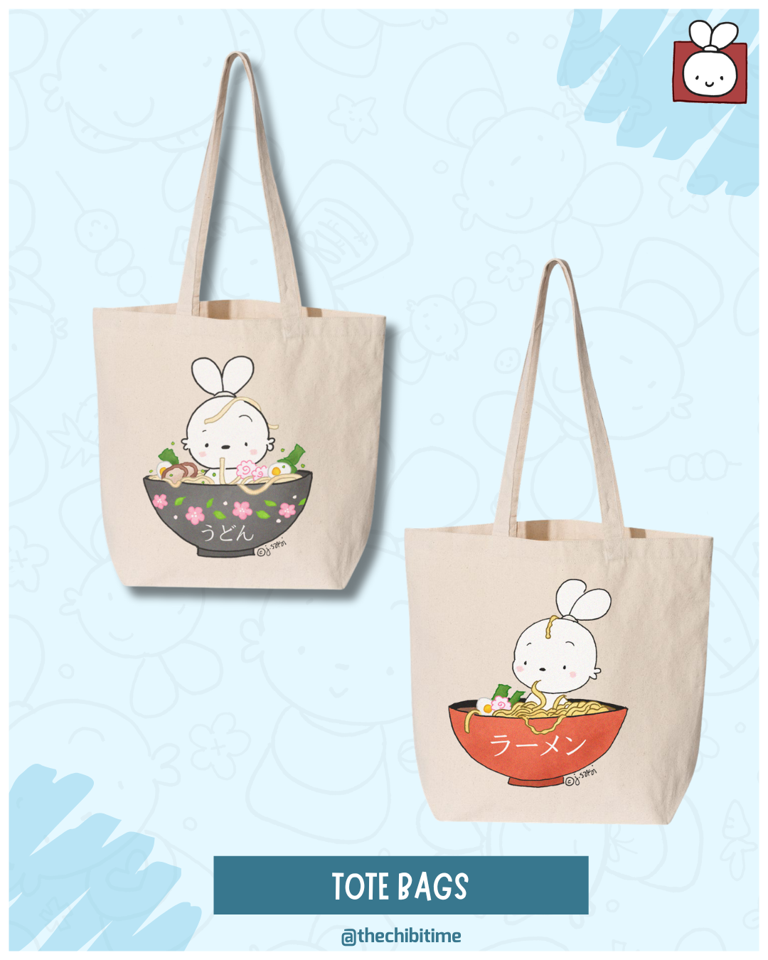 Chibi Usagi Noodle Totes! Take Chibi Usagi (and your love of noodles) on the go! These everyday tote bags feature two deliciously adorable designs: 🍜 Ramen & 🍲 Udon Printed in the USA